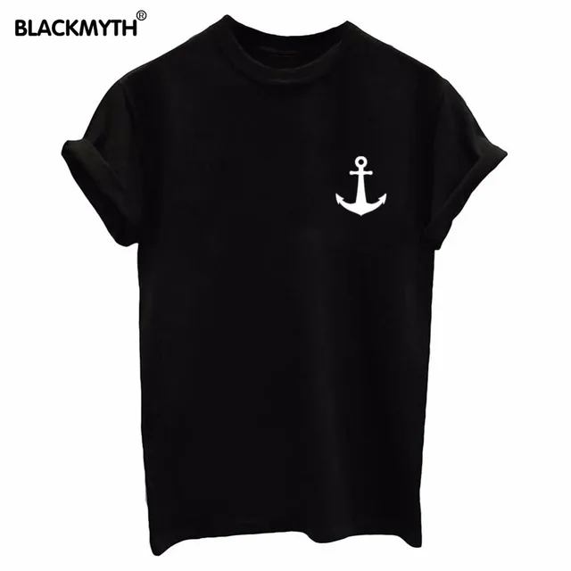 Musim Panas Fashion Kapal Jangkar Pola Dicetak Lengan Pendek Hitam