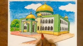 Cara Menggambar Dan Mewarnai Pemandangan Masjid Dengan Gradasi Warna