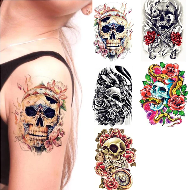 Tahan Air Sementara Tato Tengkorak Kepala Bunga Mawar Tatto Flash