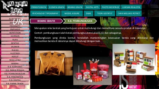 Kajian rekaan seni visual ini mengandungi sembilan tugasan iaitu kraf tembikar kraf batik seni arca seni cetakan timbulan ilustrasi pembungkusan reka bentuk hiasan dalaman dan reka bentuk industri. E jenama dan ilustrasi jika perlu f amaran jika bahan mengandungi racun g logo nama syarikat dan alamat pembuat barangan jenis pembungkusan a barangan lembut atau serbuk b barangan keras c barangan cecair d barangan bantuk krim atau pelekat. Dan fikir kesesuaian idea yg meletop untuk hasil karya sendiri.