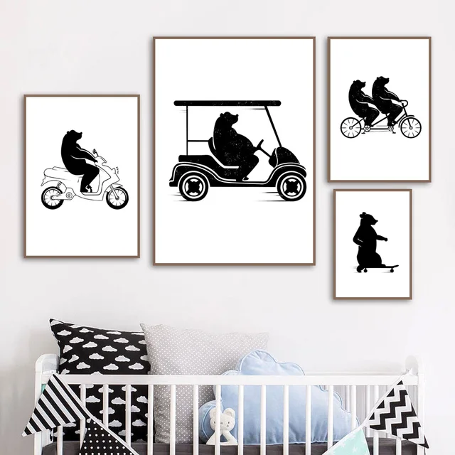 Kartun Hitam Putih Beruang Sepeda Motor Mobil Golf Nordic Poster Dan