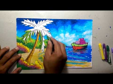 Cara Menggambar Pemandangan Alam Pantai Dengan Krayon Oil Pastel